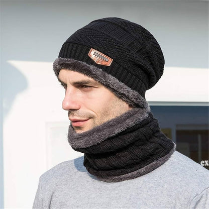Winter Cap and neck Elastic Knitting Thick Fleece Warm Woollen Beanie Cap Sport Hat & Neck Scarf Set 2 Piece