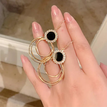 Elevate your jewelry collection with these stunning triple-hoop dangle earrings, designed to exude sophistication and charm. Featuring a bold circular centerpiece surrounded by delicate rhinestones, these earrings are a perfect blend of modern allure and classic elegance. The intricate triple-hoop design adds a unique touch, making them a standout accessory for any occasion.